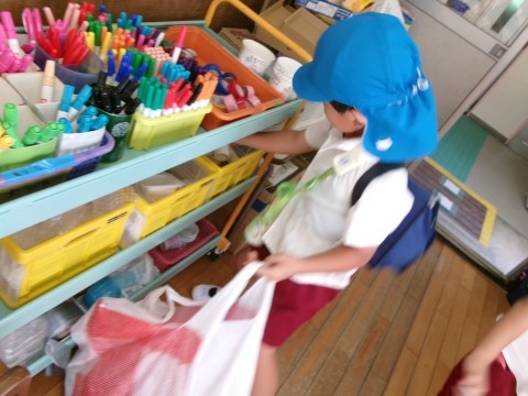 登園した子どもが,自宅から持ってきた素材を種類ごとに分けています。自分の目で一つ一つ確かめながら分けていますよ。自分で分けることで,どんな素材があるのかを把握したり,形や大きさ,手触りなどに気づいたりと,子どもの学びにもつながっていきます。つくってあそぼうに向けて,子どもたちが「これを使って〇〇をつくりたい」「これは△に使えそう」など意識しながら素材集めができるといいですね。おうちの方に協力してもらいながらがんばってね。
