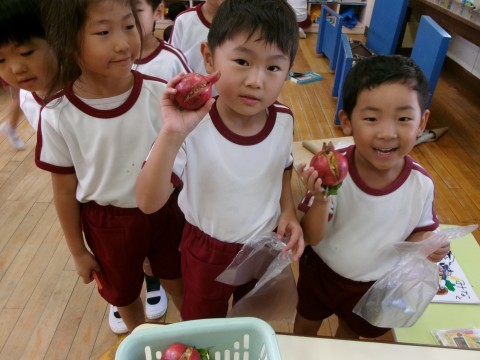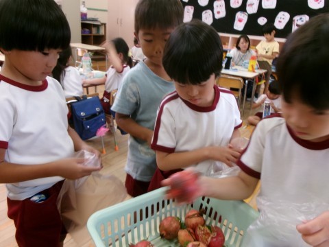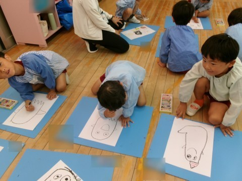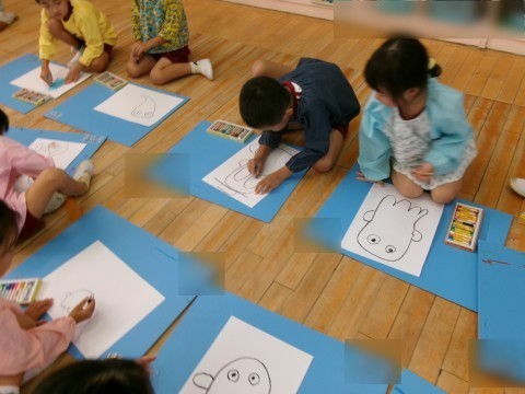 10月には子どもたちが楽しみにしている「ハロウィン」があります。絵本を読んだ後に「オバケ」の絵を描きましたよ。「目が3つあるねん」「口は大きくする!!」など,それぞれが自分なりのオバケを描くことを楽しみました。オバケを飾った後に,カボチャもつくってみましたよ。