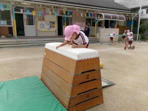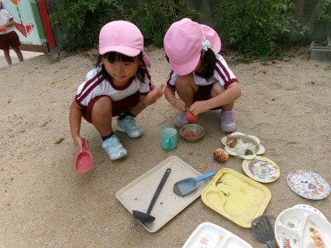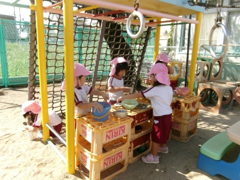 朝は,運動遊びやままごとなど体を動かしたり,ごっこ遊びをしたりしてを楽しんでいます。ままごとでは,「ザクロでご飯つくるねん!」とザクロの実の中の粒を一つずつ丁寧にとって,料理に使う姿がありました。
