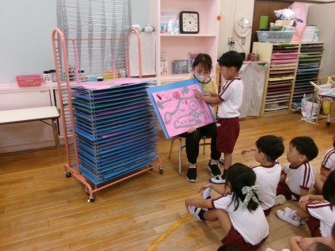 保育室では,昨日の絵の続きを描きました。「ぐるんぱが子どもたちと一緒に遊んでいるところやねん!」「大きなクッキーも描いたよ!」などと自分なりにイメージをしながら描く姿がありましたよ♪