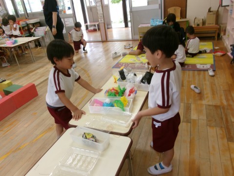 午後の自発活動では,お店屋さんごっこを楽しむ子どもたちの姿がありました。「いらっしゃいませー!」「何が欲しいですか?」などとごっこ遊びを楽しんでいましたよ😊
