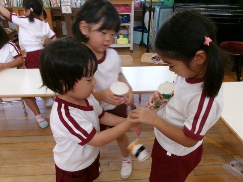 紙コップに,ビニールテープを切ってつけて飾りをつけました