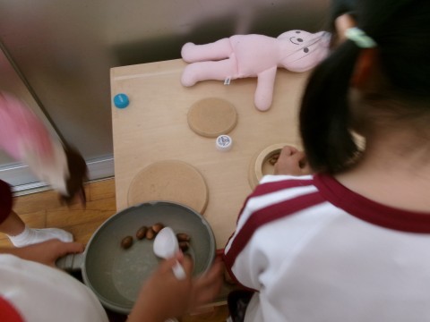「朝公園でどんぐりが落ちているのをみたよ」「葉が黄色になっていた!」と自分でみつけた秋を伝えていました