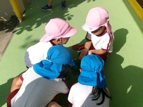 朝の自発活動では,「ダンゴムシどこにいるんだろう?」と探す子どもたち。ある子どもが,「土の中で眠ってるよ!」と教えてくれたので,スコップで掘ってみることにしました。スコップで少し土を掘ってみると,本当にダンゴムシがいました。「ほんとだ!みつけた!」と嬉しそうに友達と一緒にダンゴムシに触れていましたよ。