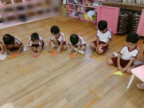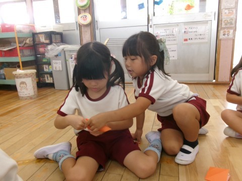 保育室では,折り紙を折って遊びました。今日は,かぼちゃを折る際に,「ひらいてつぶす」折り方に挑戦。初めてだったので,難しそうにする姿もありましたが,最後まで諦めずに折ることができたね♪弁当後のお腹休憩の際にも,もう一度折ることに挑戦してみる姿もありましたよ。