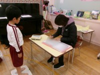 以前「アイドルコーナーに2階席があったらいい!」というアイディアがあったので,2階席ってどんなものかをみんなで共有しました。「階段みたいになってる!」と実際にソフト積み木を置いて見せてくれました。