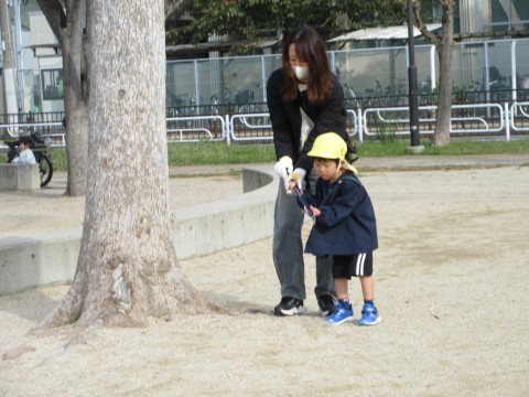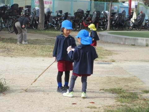 いつも遊んでいる三国ヶ丘公園や園周りの歩道を親子みんなできれいにしました。