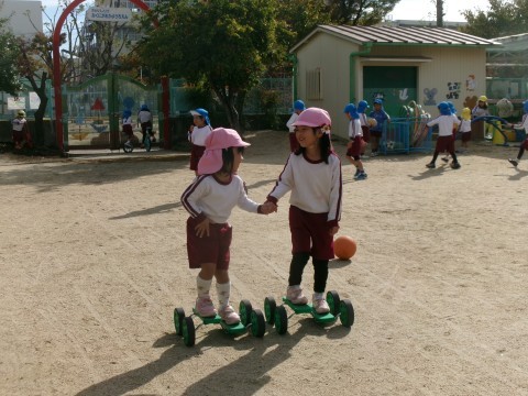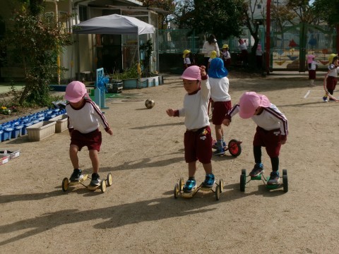 自発活動では,バランスカーに挑戦する子どもたちがいました。落ちても何度も挑戦する姿や友達と手をつないで一緒に乗ることを楽しんだり,すれ違う時にハイタッチしたりする姿もありました。少し進めると,「こんだけ進んだで!」と嬉しそうにしていました😊