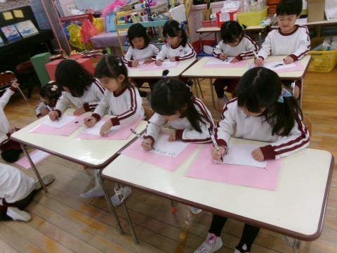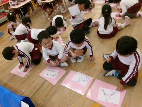 保育室では,つくってあそぼうのカット絵を描きました。今楽しんでいるつりや食べ物屋さん,アイドルの絵を描きました。「これは,大物の魚が釣れたところやねん!」「アイドル達を描いたよ!」などと描きながらお話してくれましたよ♪