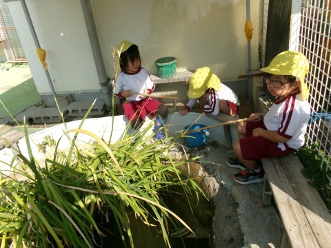 ザリガニ釣りをしたり,木に樹液がついているのをみたり,ままごとをしたりしてのびのびと遊んでいます