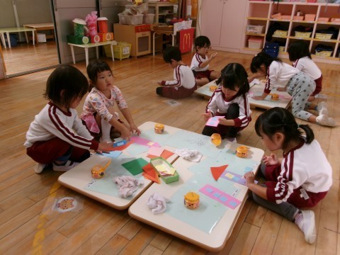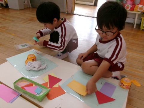 四角や三角の画用紙を組み合わせて家や電車をつくりましたよ