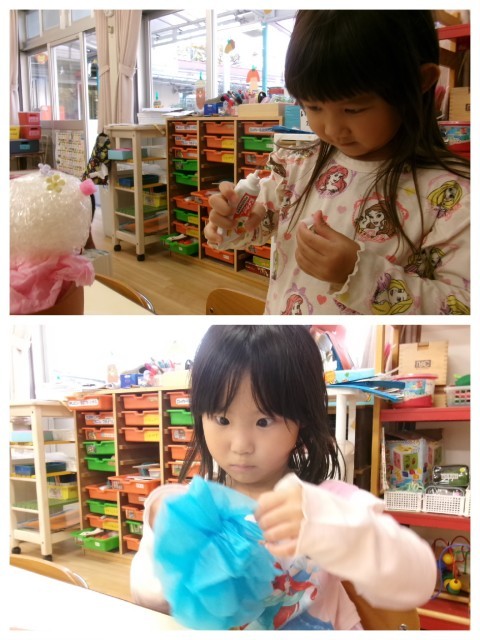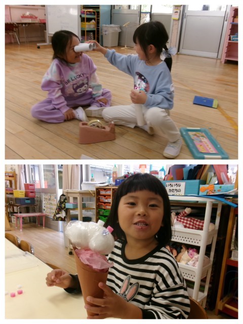 いろいろな素材や廃材を使って双眼鏡や携帯,ソフトクリームなど作って楽しんでいました(*^-^*)