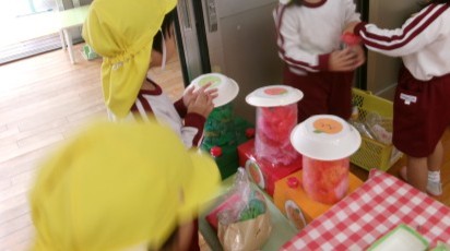 ハンバーガーやパンの絵本で,お店屋さんごっこで食べ物をつくっていることもあり