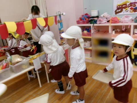 スパゲッティやオムライス,ハンバーガーなど,教師や友達と一緒に食べる真似をしていました!