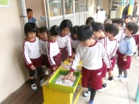 今日は,たんぽぽ組さんと一緒にお店屋さんごっこをして遊びました。店員さんとして,たんぽぽ組さんをおもてなししたり,お客さんとしてたんぽぽ組さんのお店に遊びに行ったりしました。