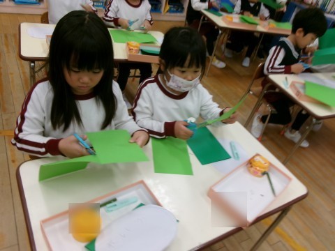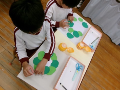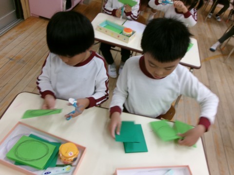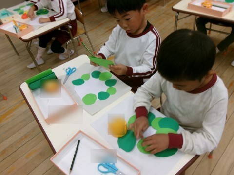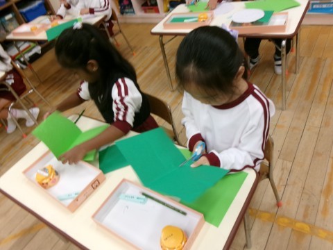 画用紙を半分に折って切る→切った画用紙を半分に折る→○を描く→重ねて切る・・・すると,みどりと黄緑の画用紙で合計8枚の○が出来上がり!!