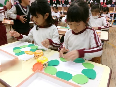 小さな○を土台の上に交互に並べてリースの形をつくりましたよ。