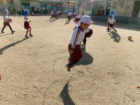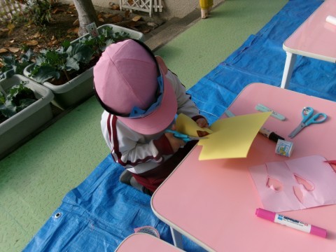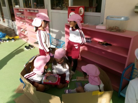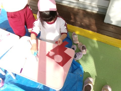 自発活動では,今日もごっこ遊びやなわとびを楽しんでいます。「ここがお家やねん!」と段ボールでおうちをつくったり,変身するためのアクセサリーをつくったりとごっこ遊びに使うグッズも増えてきました。「変身!って言いながらこのハートを押して,くるんって回ったら変身できるねん!」と見せてくれました。