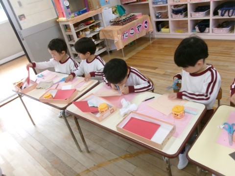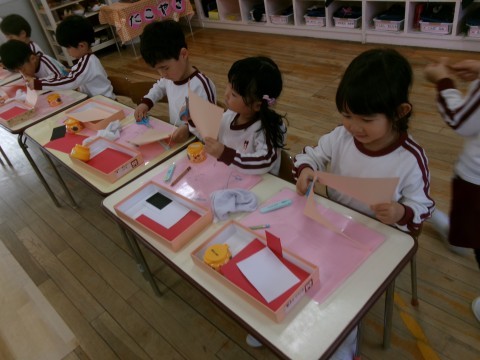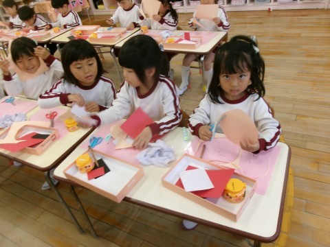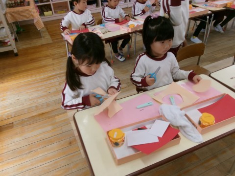 保育室では,クリスマスの絵本を読んだ後,サンタさんの顔をつくりました。画用紙を切って,ヒゲにフワフワの綿を使いましたよ😊「顔には目がいる!」「眉毛もいるな~!」と顔に何があるかを考えながらつくる姿がありました。それぞれ違った表情をしていてかわいいです♡