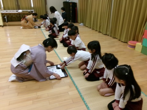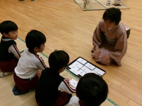 白本先生に茶道具の名前について教えていただきました。「柄杓」「茶杓」「茶筅」など,子どもたちには馴染みのない言葉ですが,覚えることができたようです。