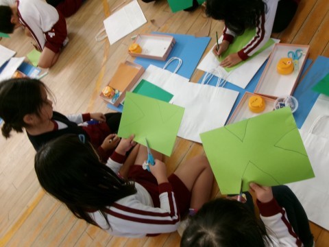 画用紙を三角に切って,ツリーになるように重ねて貼ります。ツリーに飾りを描き,サンタクロースやトナカイなどもかわいく描いていましたよ。