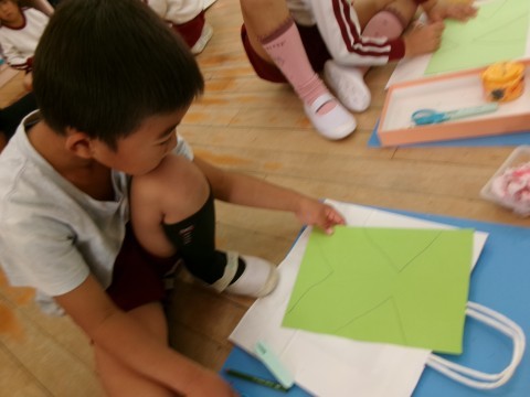 「サンタさんにプレゼントもらえますように」と願いを込めて,紙袋にツリーの飾りをつけました。