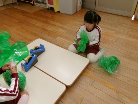 部屋では,透明の袋にカラーポリ袋を入れて,もみの木をつくりました
