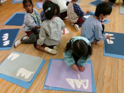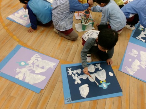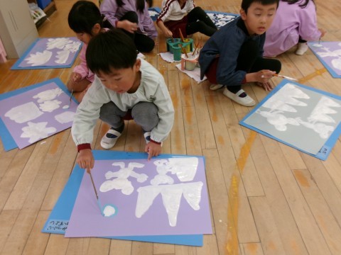 氷の山やしろくま,ペンギン,雪,などをイメージしながら絵の具で描きました。「氷の山は大きいねんで」「ペンギンさんは雪のボールもってるねん」など,友達と話していましたよ。