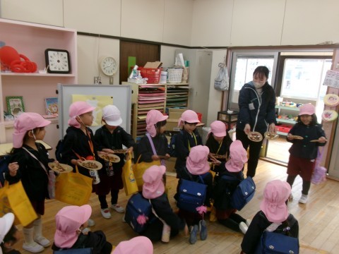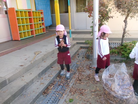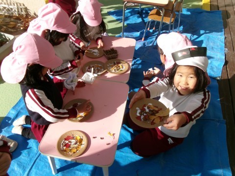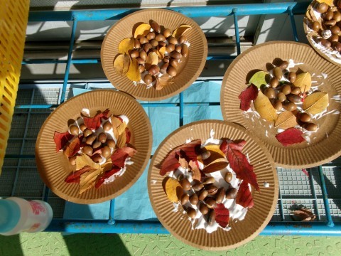 園庭にたくさん落ち葉が落ち始めてきました。自発活動では,落ち葉を集めて雨のように降らせて楽しんだり,黄色や赤色,茶色などいろいろな色の落ち葉を使ってピザづくりを楽しんだりしていました。ピザづくりでは,赤色をトマト,黄色をチーズなどといろいろなものに見立てながらつくっていましたよ😊降園前の振り返り時にみんなに見せてくれました!