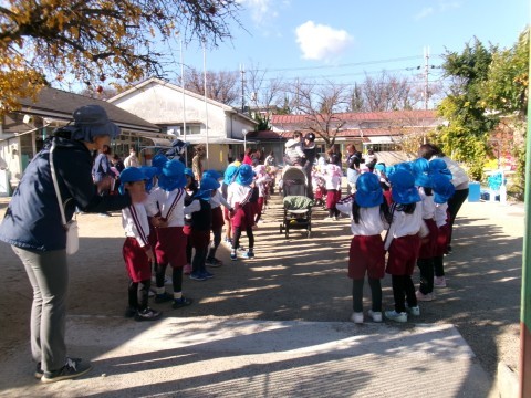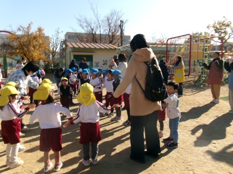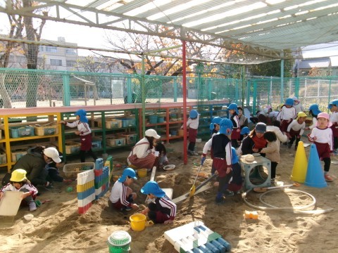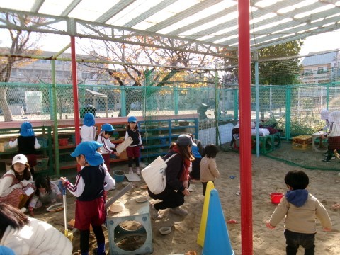 今日はまめっこがありました。寒かったですが、元気に遊びにきてくれました。ボール遊びや遊具、三輪車や砂場など好きな遊びを楽しんでいました。中でも砂遊びが人気で、砂をカップに入れたり、型抜きをしたり、カレーやケーキを作っていました。十分に遊んだ後は、幼稚園の友だちと体操をしました。初めは少し緊張していたまめっこちゃんも、音楽がかかると嬉しそうに踊っていました。