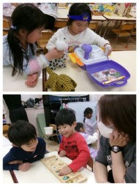 楽器を演奏する楽しさをもっと味わおうと,保育室でも楽器に触れて遊びました。