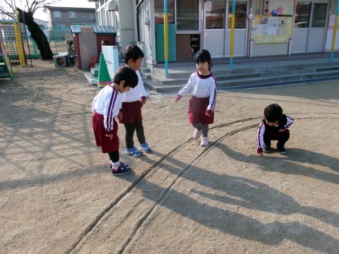 子ども達はサンタクロースに会えたことがとてもうれしく,ウキウキしながら部屋へ帰ると,園庭には,そりの跡がありました!