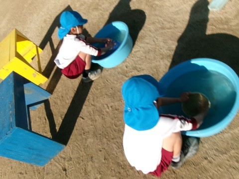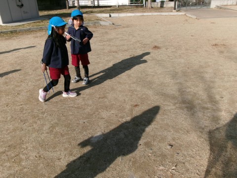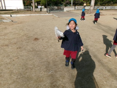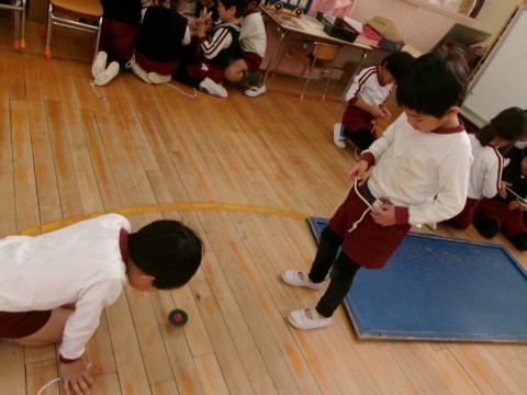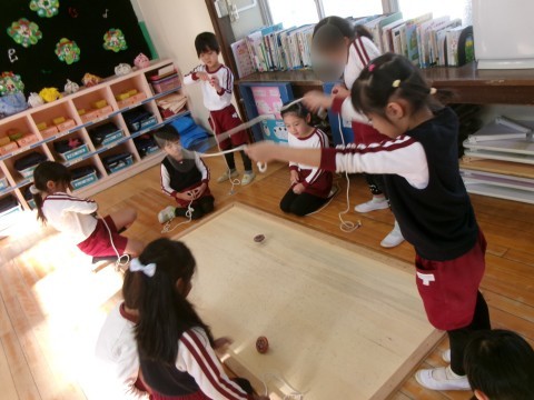 「回った!!」と大きな声で喜ぶ声が聞こえてきます。コマ回しが上手になってきた子どもたちです。少しずつコマ回しに成功する子どもたちが増えてきましたよ!!午後からは,うさぎ組さんやたんぽぽ組さんも一緒にコマ回しを楽しんでいました。