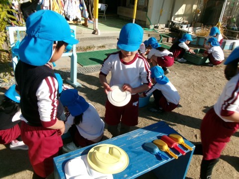 今日は日差しもあり気温も高かったので,砂場のおもちゃをきれいにしました。