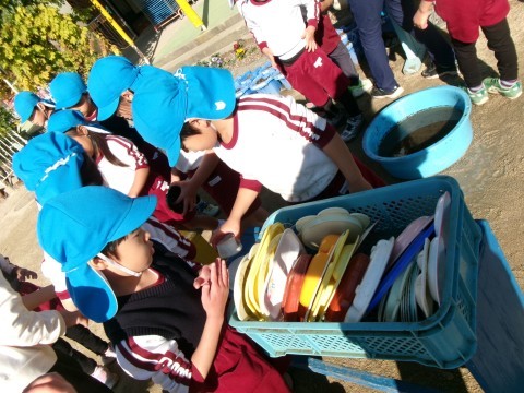 水できれいに洗った後は,種類ごとに分けて干していきます。「これはどこかな?」「バケツはこっちやで」など,友達と話しながら楽しんで取り組んでいましたよ。子どもたちの頑張りでピカピカになりました!!