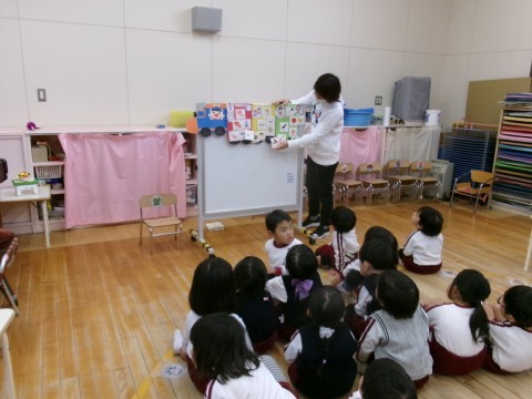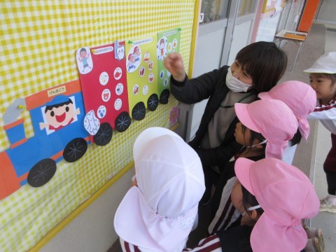 なぜバランスよく食べる必要があるの?食べ物にはどんな栄養があるの?と各クラスで話しあったり、一緒に考えたりしました。職員室の前に貼っている元気号を見て、「ご飯もパンも食べたよ!」「カレーの中に全部(3食品群)入ってた!!」「お肉食べたから体強くなってる!」などと、友だちとも話しています。「しいたけは?」「大豆は?」と、元気号に貼っていない食材に気づき「どんな力があるの?」と尋ねる姿も見られます。子どもと一緒に考えながらいろんな食品を増やしていきたいです。保健指導を通して、苦手なものでも食べてみようとしたり、自分の体に興味関心をもったりしてほしいと思います。