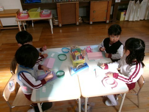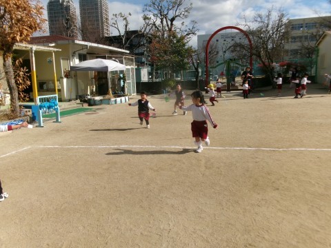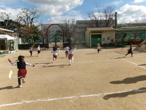 今日は,戸外でたくさん遊んだ後,凧をつくって,凧あげをしました