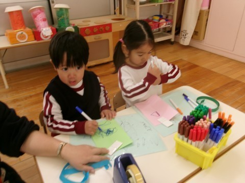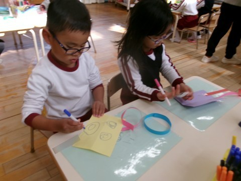 マジックで絵を描いたり,紙テープを貼ったりしました