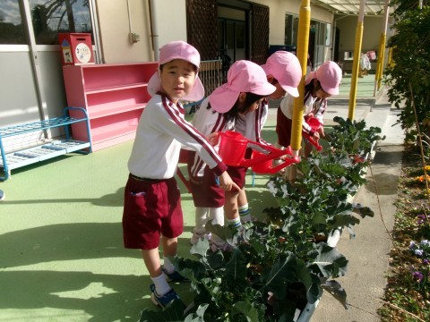 ブロッコリーのお水やり頑張っています。「あっ!ブロッコリーの赤ちゃんできてる!」と発見✨「いつできるかな?」と楽しみにしていたのですごくうれしそうにしていました。