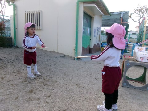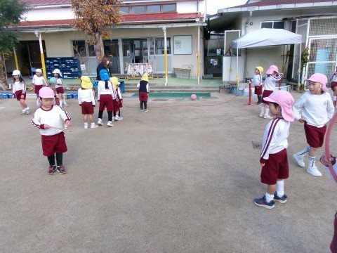 自発活動では,ホッピングや羽つきをして遊ぶことを楽しんでいました。昨日読んだ絵本にのっていた羽子板!「初めてやけどやってみる!」と挑戦してみる姿がありました。1人で何回つけるかな?とやってみたり,友だちと一緒に羽根つきをしたりして楽しんでいました😊