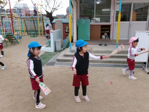 今日の園庭では,羽根つきやたこあげなど,正月遊びを楽しむ姿が見られました。