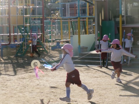 園庭では,昨日つくった凧あげを楽しんだり,登り棒に挑戦してみたりする姿がありました。凧あげは,「ヒモを短くしたらとびやすいよ。」「この坂の上から走ったらよくとぶねん!」「手を上にしながら走ったらいいんだよ!」などと遊んでみて気づいたことを教えてくれます!