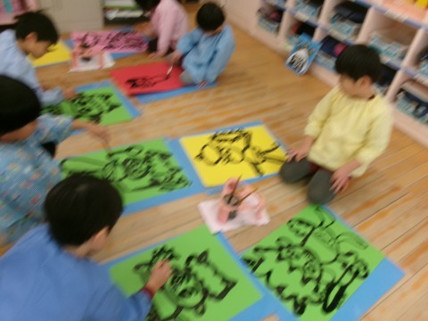 いつもは絵の具を使うことが多いのですが,今日は墨汁を使いました。画面いっぱいに力強く,のびのびとオニを描いていましたよ。