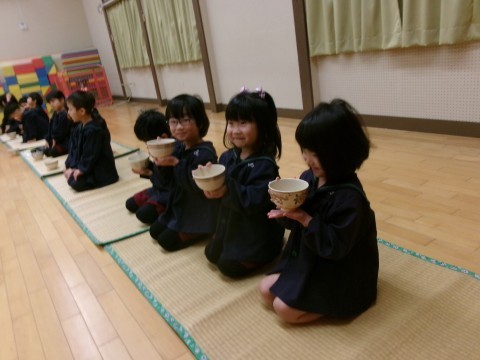 今日は,茶の湯体験がありました。「早くお茶飲みたいな~!」と朝から楽しみにする姿がありました。「茶筅」「茶入」などの茶道具について教えていただいたり,お茶をたてているところを見せていただいたりしました。その後は,実際においしい干菓子とお抹茶をいただきました。前回よりも頑張れるようになり成長した姿を褒めていただきましたよ😊貴重な体験をありがとうございました!