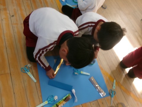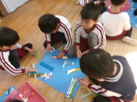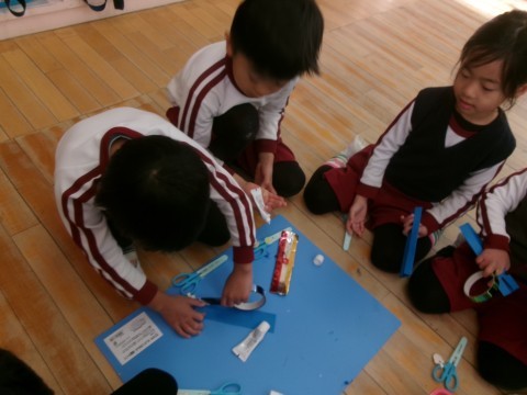 保育室では「たんけんブレスレット」をつくりました。これをつけたら「そらぐみたんけんたい」に変身するよ!!