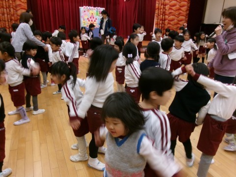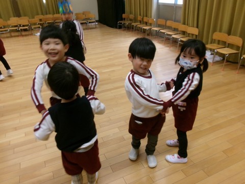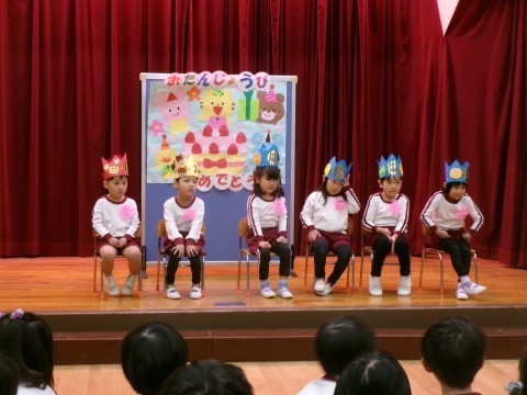 今日は,1月生まれのお誕生会がありました。お誕生日のお友だちに質問をしたり,ハッピーバースデーの歌を歌ったりして,お祝いをしましたよ。最後には,違うクラスのお友だちと,玉ねぎせっせっせやなべなべそこぬけ,ジェスチャーゲームをして遊びました😊