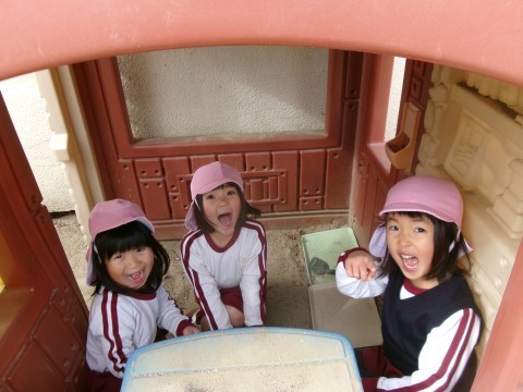 自発活動では,自然物を使ってお料理づくりをしたり,秘密基地づくりをしたり好きなことを見つけて楽しんでいます。おうちの中で遊んでいる子どもたちは,透明人間に見つからないようにこっそり遊んでいたようで,教師がのぞくと「みつかったー!」とびっくりした様子でした!