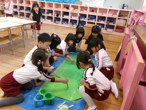 お弁当後には,ごっこ遊びで使う草に色を塗りました。「ザリガニが出てきた時に,ここに隠れられそう!」などと友だちと話しながら色を塗る姿がありました。明日のごっこ遊びで使うのが楽しみだね♪