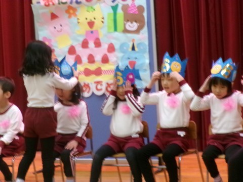 お友達からすてきな冠をプレゼントしてもらい,にっこり笑顔の子どもたち。うれしそうにしていました。