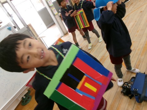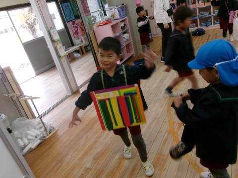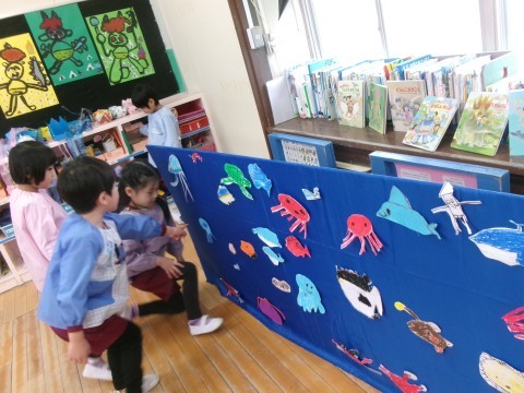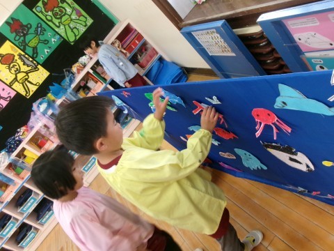 保育室の戻ると,劇遊びでつかう海の場面をみんなでつくりました,「ぼくは,カニを描こうかな」「クジラは?」「フグにする!」「クラゲもおるで~」など,友達と会話を楽しみながら描いていました。